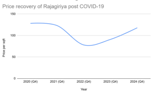 Over the five-year span from Q4 2020 to Q4 2024, Rajagiriya’s has made remarkable recovery to its pre-pandemic prices. Its price recovery from the 2022 trough (USD 78 per sqft) to 2024 (USD 118) represents a 51.3% gain in just two years, the second highest among 13 other suburbs, only behind Mount Lavinia.